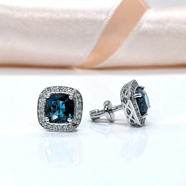 Elegaantsed 925 prooviga hõbekõrvarõngad, mille keskel on padi-lõikega (cushion) kivi. Tumesinine, Londoni topaasi meenutav tsirkoon on ümbritsetud säravatest väikestest kristallidest haloga, mis loob luksusliku ja mahlaka välimuse.