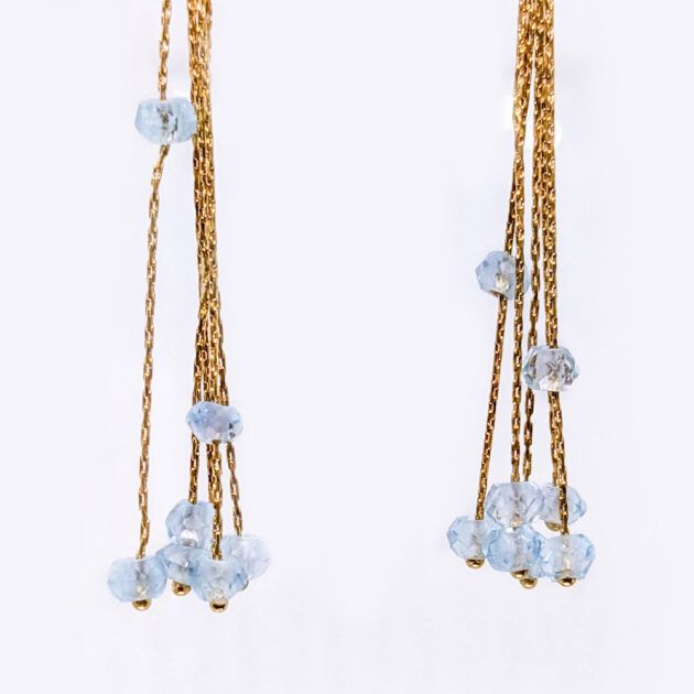 Õrnad kullast kõrvarõngad topaasidega – kerguse ja elegantsi kehastus. Peened kuldketid liiguvad graatsiliselt iga liigutusega, samal ajal kui õrnalt sinised topaasihelmed lisavad rafineeritud sära. Need kõrvarõngad sobivad ideaalselt romantiliseks õhtuks, pidulikuks sündmuseks või kingituseks, mis rõhutab isikupära ja head maitset. Ehtekunst, mis muudab teie välimuse unustamatuks! Roosa kuld 14 kt, kõrvarõngad kaal 3,10 g.