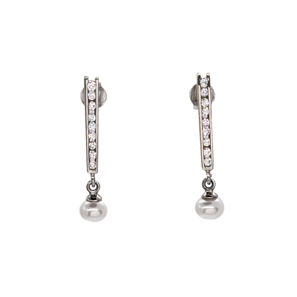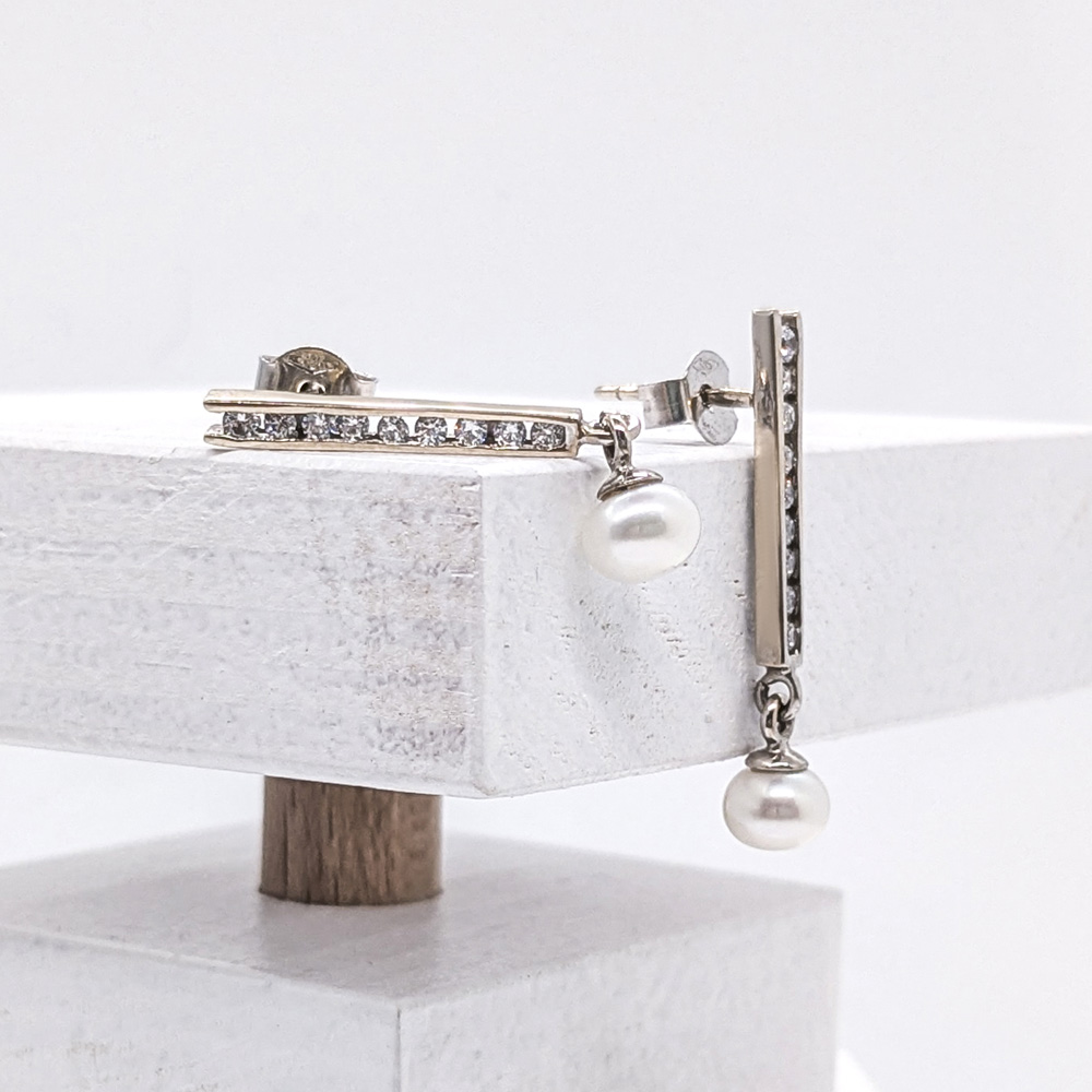 Lakoonilised kõrvarõngad tsirkooni ja pärlitega liblikkinnitustega. Kõrvarõngaste keskmine kaal 1.91 g. Valge kuld 14 kt.