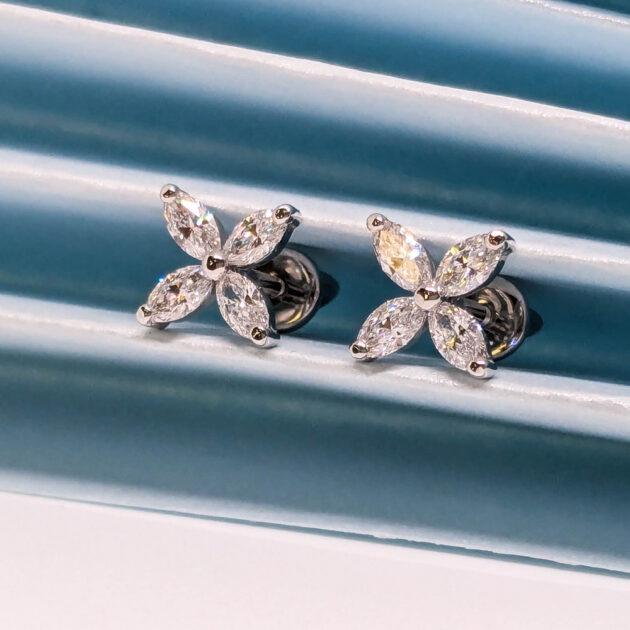 Igal kõrvarõngal on neli hiilgavat “marquise” -lõikega laboriteemanti ning kindlad kruviklambrid lisavad enesekindlust ja meelerahu.