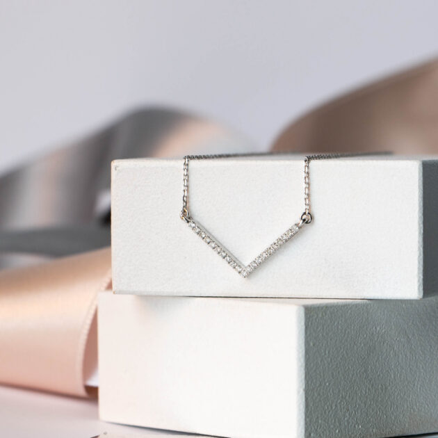 Lisage oma välimusele sära ja sära selle vapustava teemantkaelakeega. Sellel kaelakeel on õrn kett koos V-rea täislõikeliste teemantidega, mis püüavad valgust iga nurga alt. Kaelakee on valmistatud 14K valgest kullast ja sellel on kerge klamber. Kaelakee on choker stiilis, nii et see istub kõrgel kaelal ja täiendab mis tahes dekolteed. Ükskõik, kas kannate seda erilisel sündmusel või vabal päeval, see teemantkaelakee paneb teid tundma glamuurset ja elegantset. Hellitage ennast või kedagi, keda armastate, selle suurepärase ehtega.