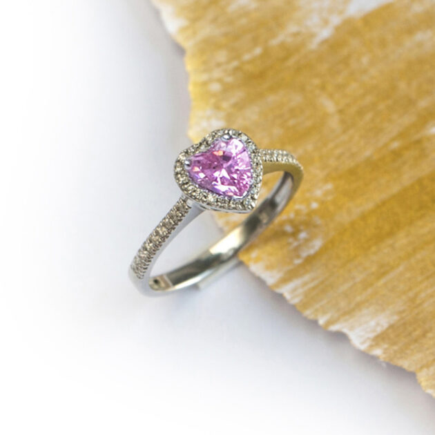 Kirkas ja hellä hopeasormus, jossa on sydämenmuotoinen pääkristalli eri väreissä.