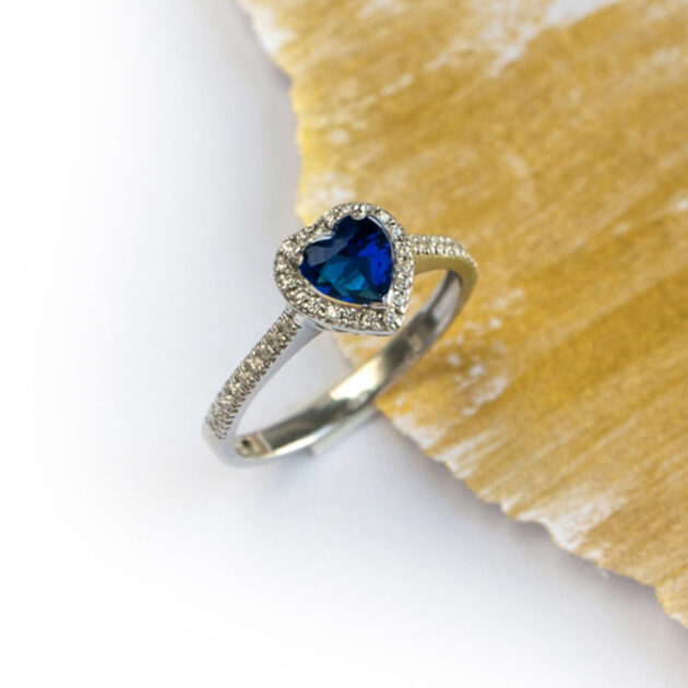 Romanttinen hopeasormus sydämenmuotoisella kristallilla eri väreissä