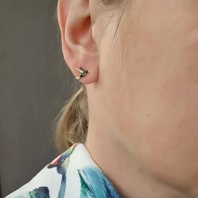 Pienet kolibrilinnut kuin korutaideteos. Käsin hiotut, laboratoriossa kasvatetut pienet smaragdit, kaikki kivet asetettu käsin! Uskomattoman söpöt korvakorut!