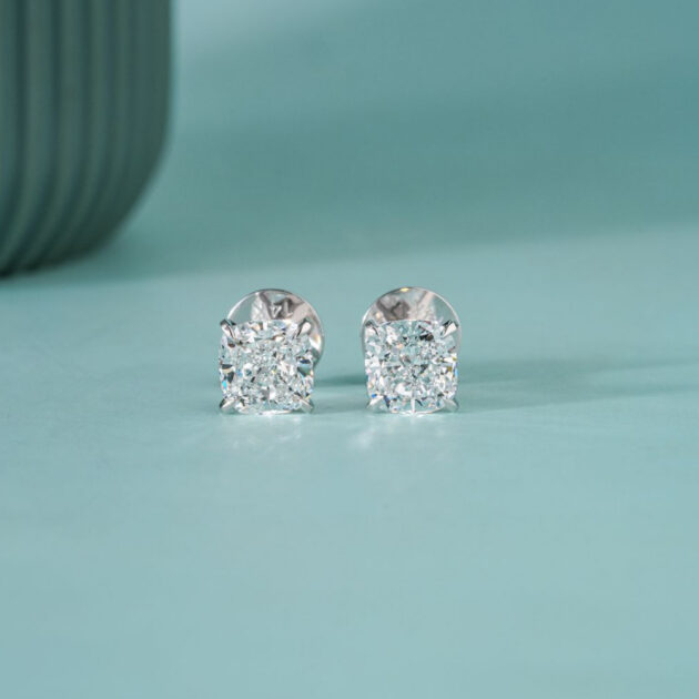 Stud earrings featuring two 1 carat diamonds each. The soft, romantic cushion cut delivers a velvety, gentle sparkle — unlike the sharp brilliance of a classic round stone. Secure screw-back clasps and prong setting ensure comfort and safety. Each diamond is IGI certified.