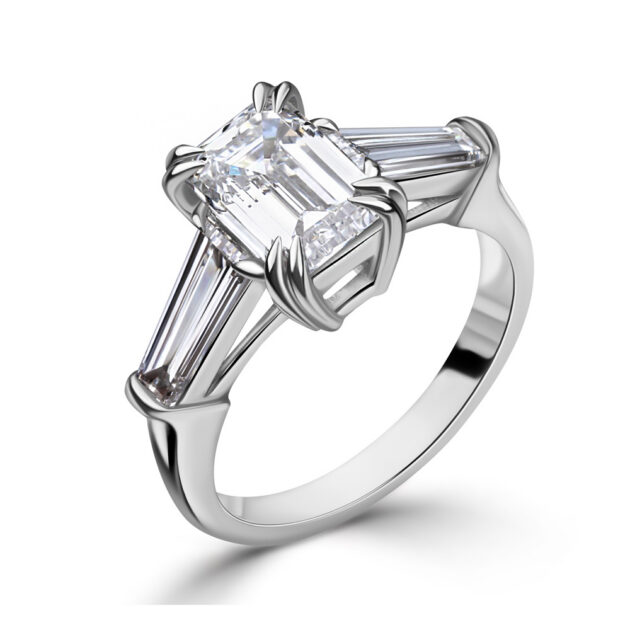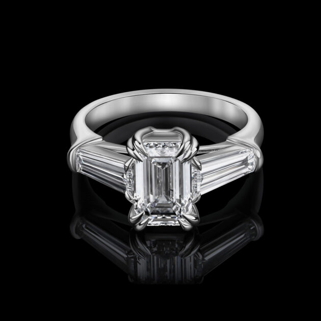 At the center is a lab-grown Emerald-cut diamond weighing 2.00 ct, with E color and VVS2 clarity. Its strict geometry is emphasized by a pair of trapezoid baguette diamonds, 0.50 ct each. A distinctive feature of this model lies in the side stones: each baguette was individually selected and certified exclusively for this ring, a rare practice that underlines its exceptional and exclusive character.