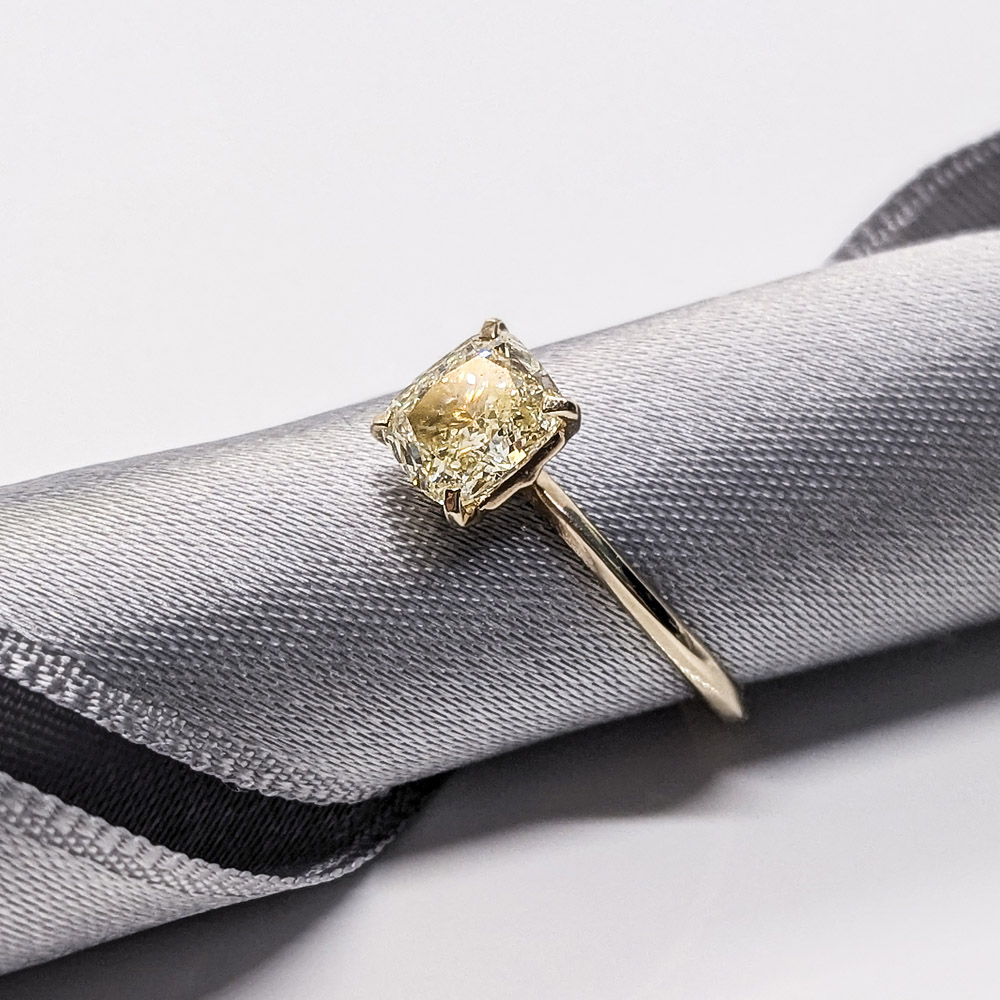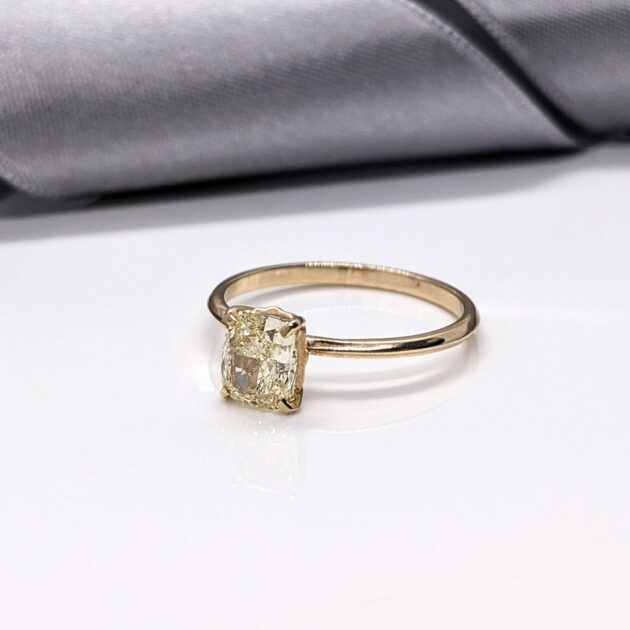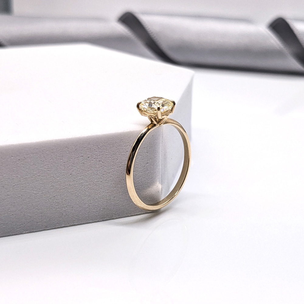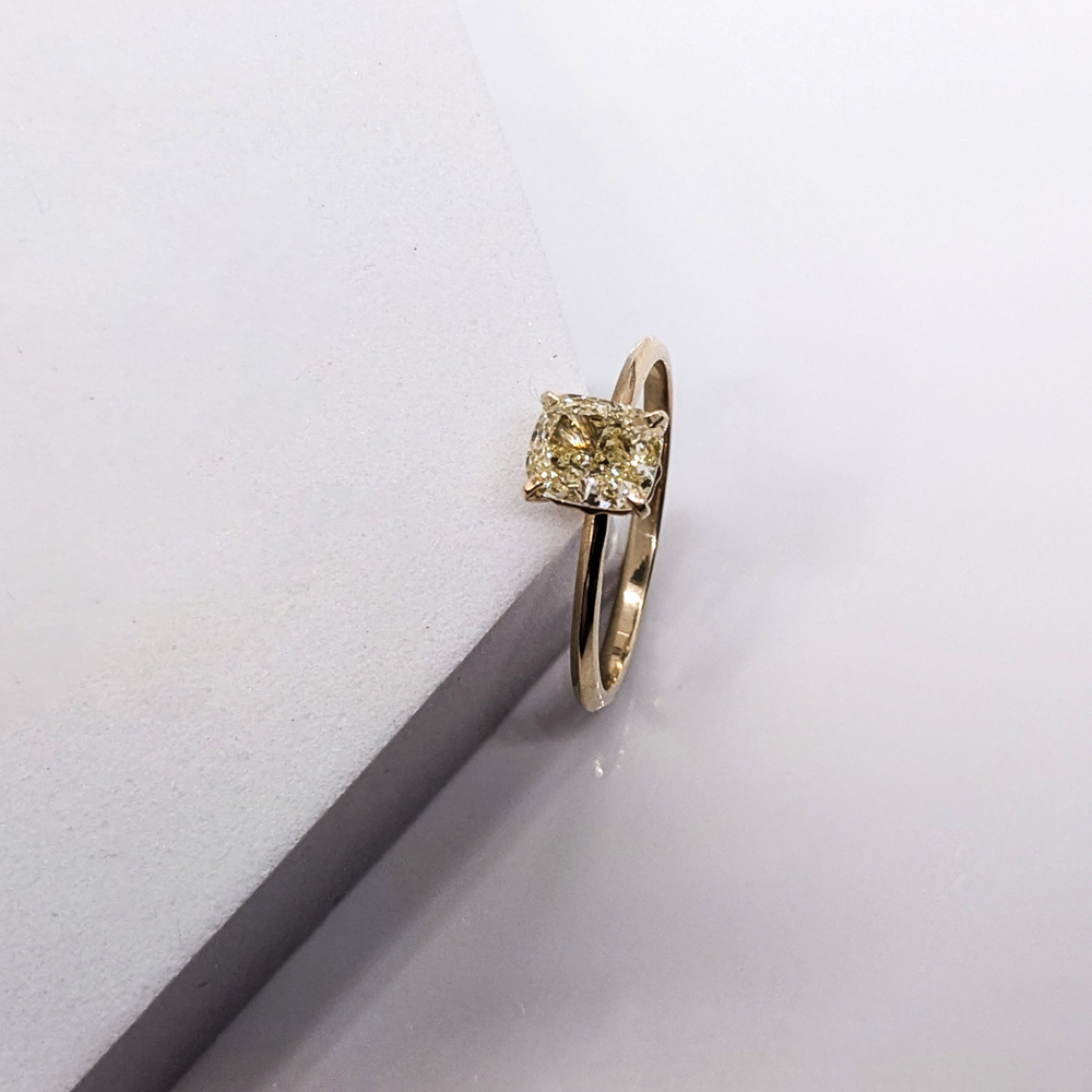 A yellow gold ring with a 1.04-carat lab-grown cushion-cut yellow diamond—a blend of elegance and sustainable luxury. Lab-grown diamonds offer the same brilliance, purity, and durability as mined stones, crafted with care for the environment. The cushion cut, with its soft, rounded edges and delicate sparkle, adds an extra depth and romantic charm to the stone. And bright and at the same time tender yellow color brings some sunshine to your everyday life. This refined design highlights your uniqueness and sophistication.