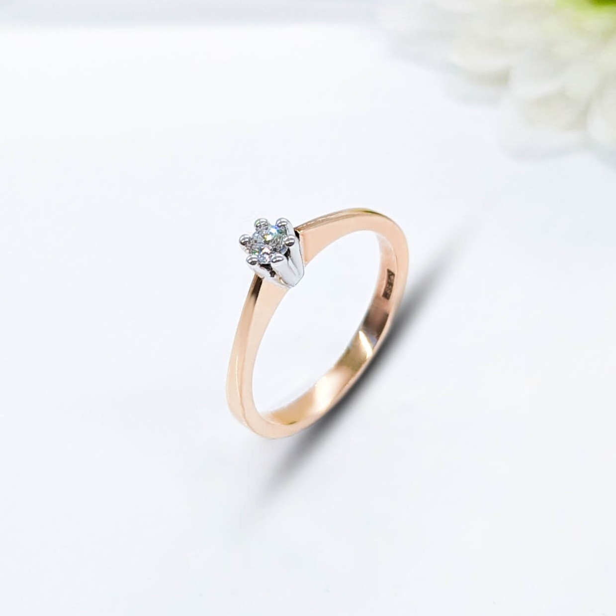 Elegant classic ring with 0.09 ct natural diamond H/SI. Small but shiny diamond set in a crown setting. Will be perfect present for a young girl to start a jewelry collection or if you do not like big diamonds.