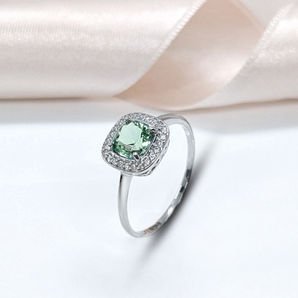 Elegant 925 sterling silver ring featuring a cushion-cut center stone. The vibrant mint-green cubic zirconia is surrounded by a sparkling halo of small clear crystals, creating a luxurious and voluminous look.