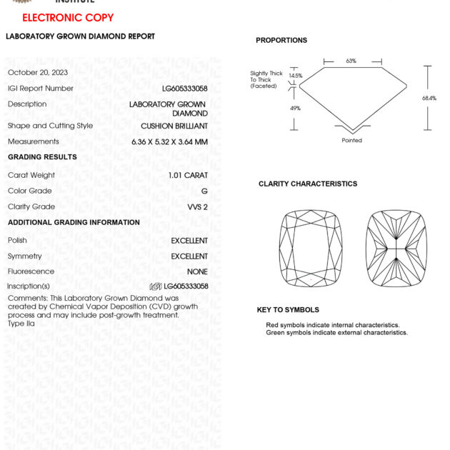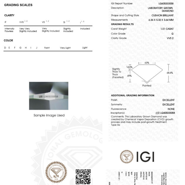 Diamond: 1.01 ct., G/VVS2, with certificate of International Gemmological Institute and has a laser engraving with it’s number on a girdle.