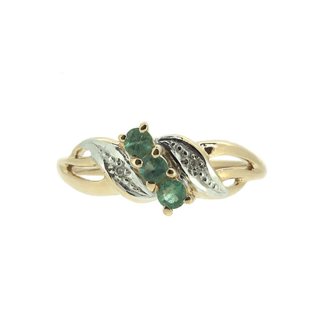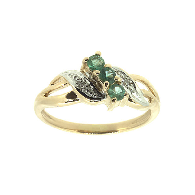 Элегантное и довольно скромное изумрудное кольцо с мелкими бриллиантами полной огранки. Не очень тонкое, воздушное кольцо с изумрудами, расположенными чуть выше остальных частей кольца.